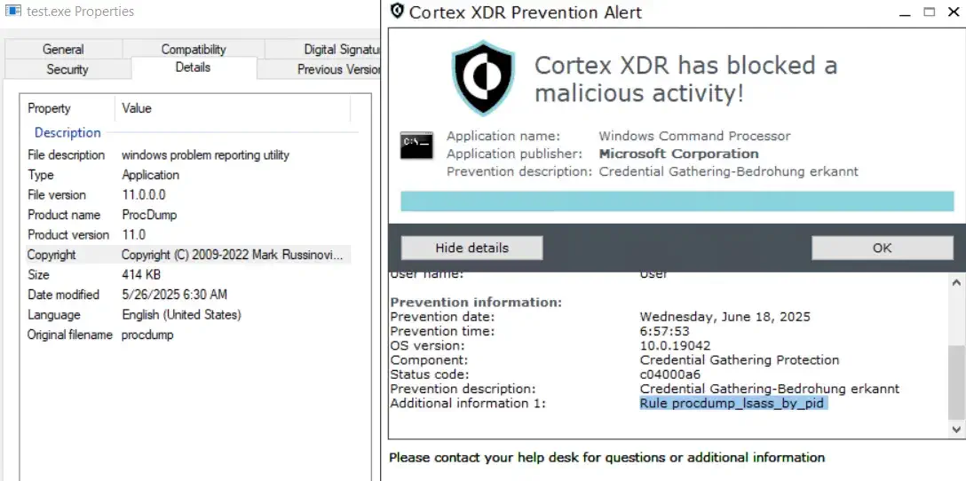 The Windows Cortex XDR agent uses CLIPS rules for behavioral detections. These rules are shipped encrypted in content updates. We decrypted these rules and discovered numerous hardcoded exceptions including global whitelists that can be abused to bypass those rules. For example, if a process’s command-line arguments contain :\Windows\ccmcache, it is excluded from about half of all behavioral detections. This allows an attacker, for example, to dump LSASS using simple, well-known techniques without detection.