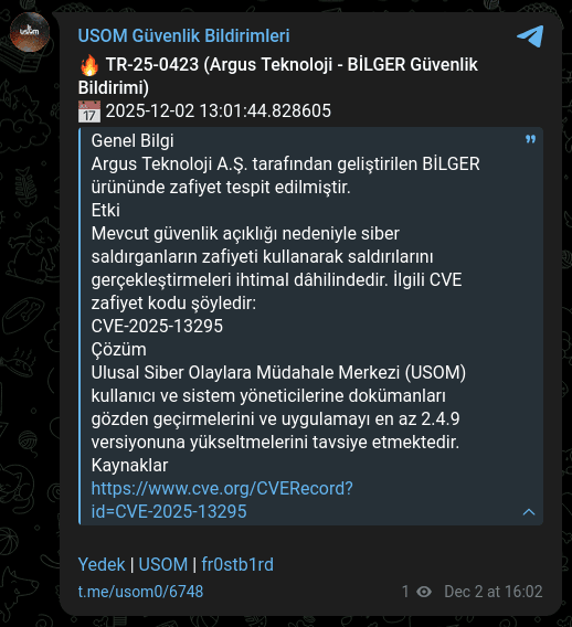 Telegram Kanalı Bildirim Örneği Şekil 1: Otomasyon sistemi tarafından Telegram kanalına iletilen anlık USOM bildirimi.