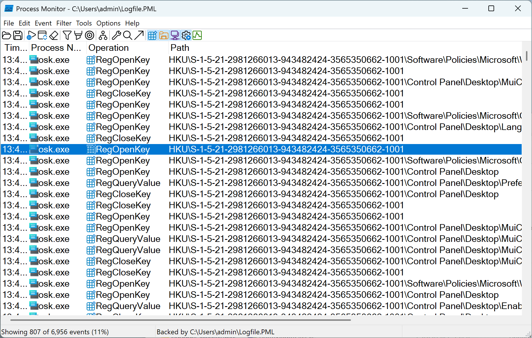 Potansiyel olarak kötüye kullanılabilecek davranışları incelemenin basit bir yolu Process Monitor’u çalıştırmak ve kısıtlı kullanıcının kayıt defteri kovanına (registry hive) veya profil dizinine erişen olayları yakalamaktır. Oturum açma oturumu kısıtlı kullanıcı ile onun UI Access işlemleri arasında aynı olduğu için kullanıcının C: sürücüsü eşlemesi gibi şeyleri ele geçirmek de mümkündür.